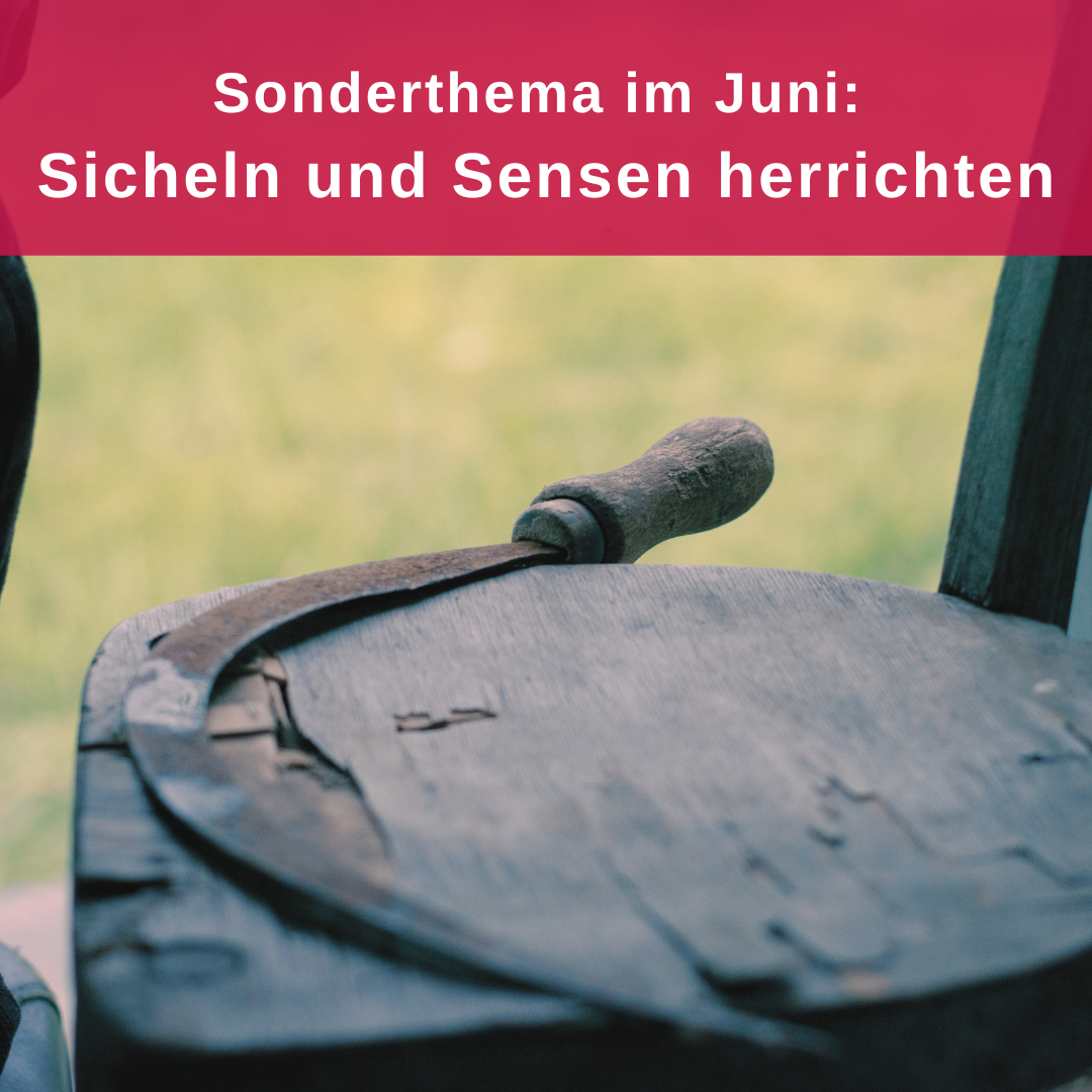 Bei unserem zweiten Reparaturtermin im Juni können wir diesmal ein Sonderthema anbieten – zusätzlich zum regulären Reparaturbetrieb: Wir schärfen und dengeln eure Sicheln und Sensen!