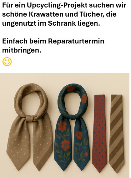 UPDATE: Für ein Upcycling-Projekt suchen wir aktuell schöne Krawatten, die vielleicht noch ungenutzt im Schrank hängen! Abzugeben bei uns beim Reparaturtermin 🙂